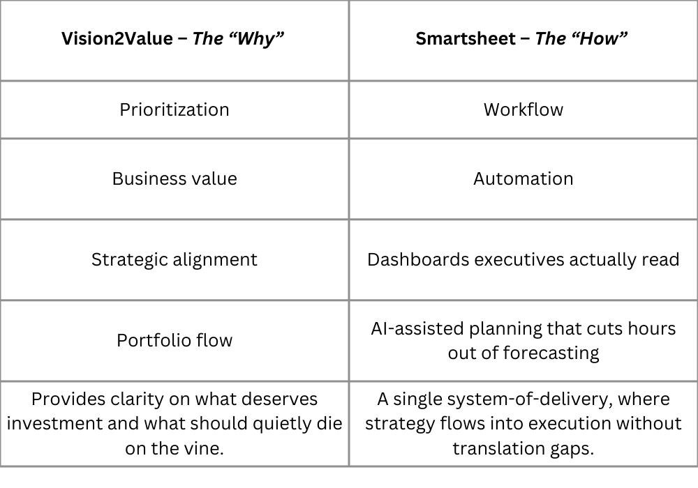 This is where Vision2Value and tools like Smartsheet finally meet.